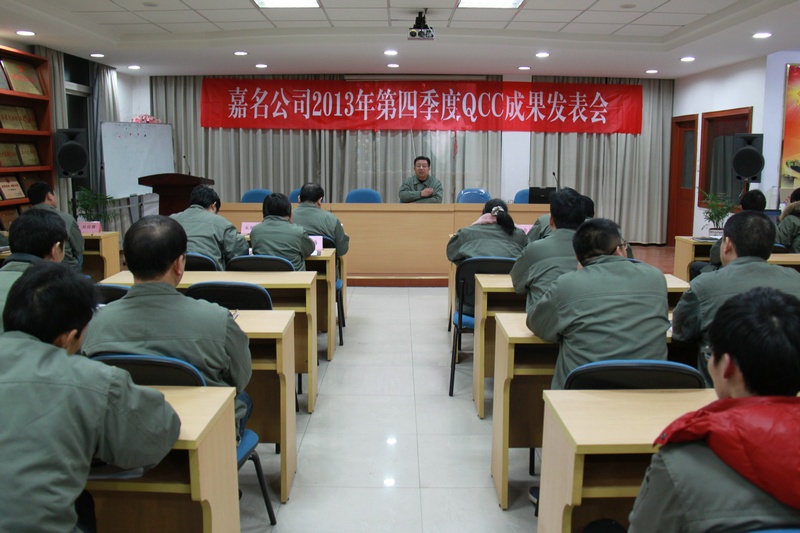 2014年1月13日晚,嘉名公司2013年第四季度(第三屆)QCC成果發(fā)表會召開,會上共發(fā)表QCC成果20項(xiàng),經(jīng)評委評選,動力設(shè)備部福生組的《降低空壓機(jī)用電量》等8個QCC成果評為優(yōu)秀獎,紡織事業(yè)部運(yùn)轉(zhuǎn)組的《如何降低氨綸汗布的反氨綸》等12個QCC成果評為鼓勵獎。