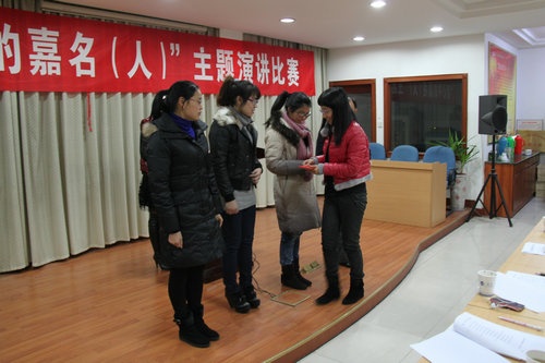 12月17日晚,公司工會(huì)、團(tuán)支部聯(lián)合舉辦的 “我心中的嘉名(人)”主題演講比賽,12名選手參加了比賽。李丹華獲一等獎(jiǎng),范曉磊、張金金獲二等獎(jiǎng),宋建會(huì)、陳華芳、楊 麗獲三等獎(jiǎng),陸松芬、謝建甫、衛(wèi)建秋、鐘曉蘭、黃孝軍、陳慧琴獲鼓勵(lì)獎(jiǎng)。鳳鳴街道黨委委員吳霞萍,公司總經(jīng)理莫炳榮為獲獎(jiǎng)選手頒獎(jiǎng)。