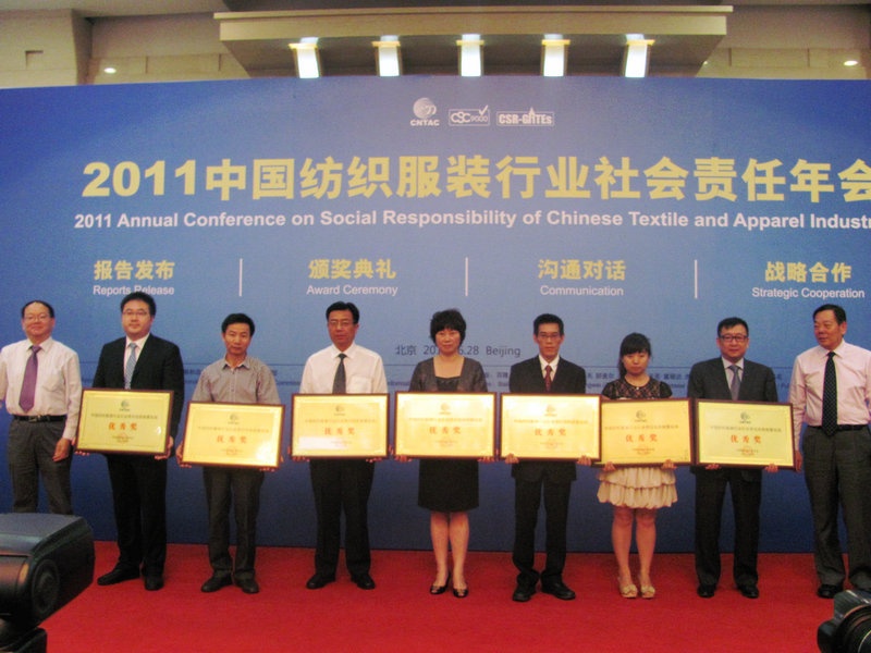 會議期間,中國紡織工業(yè)協(xié)會發(fā)布了“2010-2011中國紡織服裝行業(yè)社會責(zé)任報告”,16家紡織服裝企業(yè)同時發(fā)布了企業(yè)的2010年度社會責(zé)任報告。我公司發(fā)布的《2010年度社會責(zé)任報告》獲得了協(xié)會頒發(fā)的“2011年度中國紡織服裝行業(yè)社會責(zé)任信息披露實踐優(yōu)秀獎”。莫總在發(fā)表獲獎感言時表示:在堅持“為顧客創(chuàng)造價值、為企業(yè)增創(chuàng)效益、為員工謀求發(fā)展、為社會多做貢獻(xiàn)”的企業(yè)核心價值觀指導(dǎo)下,我們將繼續(xù)努力,為紡織行業(yè)的發(fā)展做出新的貢獻(xiàn)!